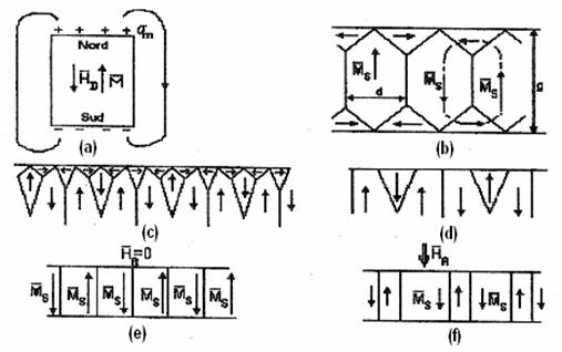 a) Materialele feromagnetice, a caror moment magnetic elementar spontan este rezultat din necompensarea momentelor magnetice de spin. Pentru minimizarea energiei interactiunilor de schimb dintre atomii învecinati, momentele magnetice de spin se orienteaza paralel, formând domenii de magnetizare, în care magnetizatia este uniforma si egala cu magnetizatia de saturatie. Susceptivitatea si permeabilitatea magnetica au valori mari, care depind de câmpul magnetic aplicat, de temperatura si de solicitarile mecanice.