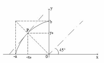 Prin urmare, punctul pentru care produsul coordonatelor este maxim este la intersectia arcului de elipsa cu diagonala dreptunghiului care intersecteaza axele de coordonate în aceleasi puncte ca si arcul de elipsa. Se observa ca exista un singur extrem, care este un maxim, pentru ca produsul coordonatelor se anuleaza în puncte de intersectie cu axele de coordonate.