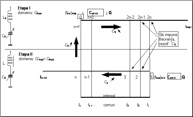 Determinarile se efectueaza cu Q - metrul si se bazeaza pe relatia (7), corespunzatoare regimului rezonant al circuitului serie format din condensatorul variabil Cv, încorporat Q - metrului - cu factor de calitate mai redus. În fig. 7 sunt reprezentate intervalele de frecventa corespunzatoare celor doua tipuri de circuite si ordinea efectuarii masuratorilor. De asemenea, este indicat sensul de modificare a capacitatii variabile.