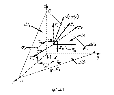Ne propunem acum sa studiem cum variaza starea de tensiune dintr-un punct arbitrar M al unui corp solicitat la trecerea intr-un punct infinit apropiat M*. Pentru aceasta din jurul punctului M(v.fig. 1.1.1) vom izola un paralelipiped infinit mic de laturi dx, dy, dz. Fetele acestui paralelipiped de muchii MA, MB, MC(care se intalnesc in punctul) le vom considera ca plane fundamentale si le vom alege drept plane de coordonate. Desenam marit acest element de volum(fig.1.1.4) si figuram tensiunile care actioneaza pe fetele lui.x)
