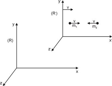 Presupunem ca cele doua bile sunt aruncate cu viteze egale si opuse v (una catre cealalta ) de-a lungul axei Ox' (sau Ox) si se ciocnesc plastic; valoarea vitezei v este raportata la referentialul (R'). Notând m0 masa inerta a corpurilor când sunt în repaus si considerând ca masa lor de miscare depinde doar de modulul vitezei, cele doua corpuri vor avea fata de (R') aceeasi masa de miscare dar fata de (R) mase diferite m1 si m2.
