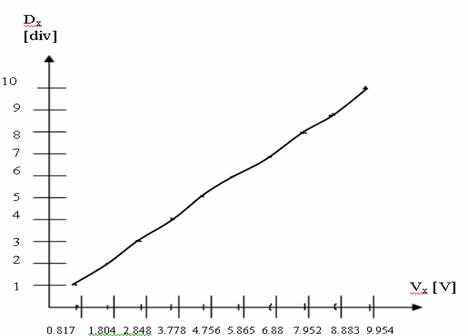 Panta dreptei se calculeaza ca la punctul precedent, numai c[ lui x ]i va corespunde Vx si lui y Dx. Astfel ca m=1.017181. De aici rezulta ca Fxmas=1/m=0,9831092 V/div.