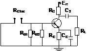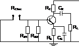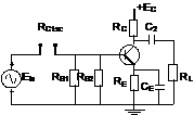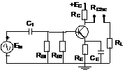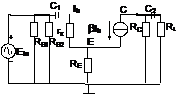 Etajul emitor comun prezentat in figura 1, pune in evidenta existenta a 3 condensatori, C1, C2, CE. Determinarea frecventei inferioare de lucru prin metoda constantelor de timp in scurtcircuit se reduce la calculul rezistentelor echivalente RC1sc, RC2sc si RCEsc care se vad la bornele acestor condensatori. Calculul lui RC1sc se face cu ajutorul schemei din figura: |
