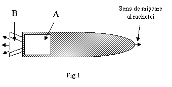 Este posibil acum sa discutam unele probleme legate de miscarea rachetei. In interiorul rachetei (figura 1) se gaseste o camera de ardere (A) in care, prin arderea combustidilului, se formeaza un jet de gaze care este expulzat printr-un orificiu (ajutaj) B.