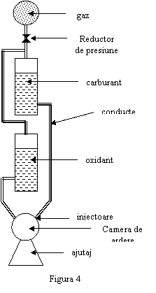 Substantele care formeaza combustibilul, denumite “componente” ale combustibilului, sunt continute in rezervoare separate – un rezervor de oxidant si un rezervor de carburant. Ele sunt impinse din rezervoare, pe conducte, spre camera de ardere. Pentru aceasta in spatiul liber din fiecare rezervor se introduce un gaz sub presiune (gazul este “inert”, adica nu schimba proprietatile componenetei). Gazul (azot, de exemplu) este imbuteliat la o presiune foarte mare (aproximativ 200 de atmosfere), pentru a “incapea” in cantitate cat mai mare in butelia respectiva. Butelia este special construita pentru a rezista la o presiune atat de mare; dar daca gazul ar patrunde cu aceeasi presiune si in rezervoare, s-ar produce spargerea acestora, intrucat peretii lor sunt mai subtiri decat peretii buteliei. Nu este avantajos sa se faca rezervoare cu peretii grosi, intrucat prin aceasta s-ar mari greutatea constructiei. (In motoarele-racheta se urmareste micsorarea cat mai mult a greutatii “neproductive”, adica a partilor de constructie si a tot ce intra in incarcatura utila a rachetei.)