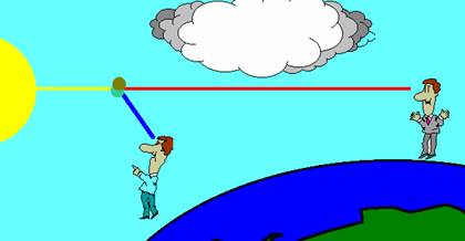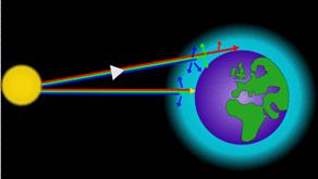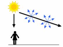 Un cer clar si însorit este albastru pentru ca moleculele din aer disperseaza lumina albastra de la Soare mai mult decât lumina rosie. Când ne uitam spre Soare la asfintit, putem observa culori rosii si portocalii pentru ca lumina albastra este dispersata în afara razei vizuale.