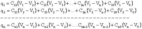 în care Cjk >0 se numesc capacitățile parțiale între conductoarele j și k, iar Cjo sunt capacitățile parțiale față de pământ.