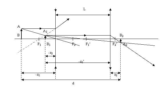 x1', x2' - distantele de la lentila la obiect (A1B1), si imaginea acestuia (A2B2).