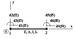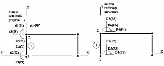 In cazul barei de cadru plan, comportarea la deformare, poate fi studiata prin raportarea parametrilor proprii, principali d1, d2, d3, d4, d5, d6 si secundari f1, f2, f3, f4, f5, f6, la un reper propriu, definit de axa x, dispusa longitudinal elementului si axa y, dispusa normal la axa longitudinala a acestuia, precum si de o a treia axa, z (normala la planul primelor doua) si la care se raporteaza momentul de inertie la in covoiere, rotirile si momentele corespunzatoare (in jurul axei z), figura 1