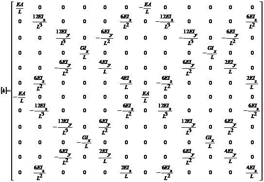 In cazul barei de cadru spatial, comportarea la deformare, poate fi studiata prin raportarea la acelasi reper propriu, xyz, ca si al barei de cadru plan, numai ca, in acest caz, parametrii proprii principali sunt, pentru prima extremitate d1, d2, d3 (translatii dupa x, y si z) si d4, d5, d6 (rotiri in jurul axelor x, y si z) iar pentru a doua extremitate d7, d8, d9 (translatii dupa x, y si z) si d10, d11, d12 (rotiri in jurul axelor x, y si z); cei secundari sunt, pentru prima extremitate f1, f2, f3 (forte dupa x, y si z) si f4, f5, f6 (momente in jurul axelor x, y si z) iar pentru a doua extremitate f7, f8, f9 (forte dupa x, y si z) si f10, f11, f12 (momente in jurul axelor x, y si z). In felul acesta putem defini termenii ecuatiei de echilibru static pentru bara de cadru spatial: