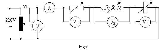 b) Pentru tensiune constanta (ca valoare efectiva) la bornele circuitului serie - masurata cu voltmetrul V - se stabilesc diferite valori corespunzatoare parametrilor R, L, C si se citesc indicatiile aparatelor, notāndu-se īn tabelul 1. Se vor realiza reglaje pentru a obtine toate variantele cu privire la caracterul circuitului (inductiv; capacitiv; rezistiv, adica rezonanta de tensiune).