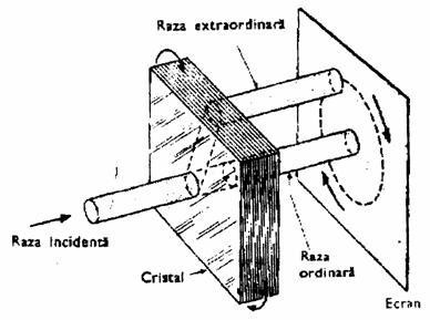 Polarizarea luminii, adica selectarea unor directii preferentiale de oscilatie ale vectorului intensitate camp electric, se face in diferite moduri, cum ar fi: prin reflexie, dubla refractie, imprastiere, etc. In acest material ne vom referi la obtinerea luminii liniar polarizate prin dubla refractie. Exista o categorie de substante, in general cristaline, transparente si omogene, care din punct de vedere al proprietatilor optice sunt anizotrope. Aceasta inseamna ca, pentru o directie de propagare data, ele prezinta indici de refractie diferiti, in functie de starea de polarizare a luminii. Astfel de substante sunt numite birefringente si, ca exemplu, vom da : calcita (CaCO3 ) , wurtita (ZnS) , cuartul (SiO2 ), turmalina si chiar gheata. Un fascicul de lumina naturala, care cade pe un cristal birefringent va fi impartit in doua fascicule polarizate, directiile de polarizare fiind reciproc perpendiculare (figura 2).