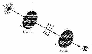 Pentru a pune in evidenta proprietatea de polarizare a luminii transmise de un polarizor, trebuie folosit un al doilea polarizor, care de obicei este numit analizor, asezat fata de primul ca in figura 6.