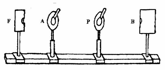 Dispozitivul experimental cuprinde o sursa de lumina naturala (bec electric B) care se conecteaza la reteaua de 220V, dispusa la capatul unui banc optic pe care se afla doi polaroizi P si A (polarizor si analizor) si o celula fotoelectrica F alimentata prin intermediul unui redresor cu o tensiune continua de 80 V (figura 7). Curentul fotoelectric obtinut datorita incidentei luminii pe fotocelula este masurat cu ajutorul unui galvanometru cu spot luminos.