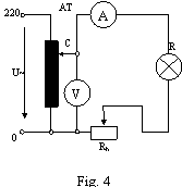 c. Pentru a determina caracteristica voltamperica a becului cu incandescenta, se realizeaza montajul din fig.4, alimentat în curent alternativ prin intermediul unui autotransformator AT. Se modifica tensiunea cu ajutorul AT, de la 0 la Un. Valorile tensiunii U si ale curentului I se noteaza în tabelul 2.