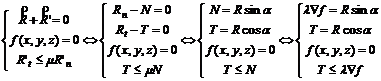 Cu notatiile din figura 29 si conform celor discutate la fortele de frecare, sistemul ecuatiilor de echilibru se scrie in acest caz dupa cum urmeaza (apare, in plus, conditia de nealunecare pe suprafata):