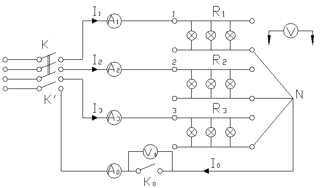 b) Sarcina dezechilibrata. Cu intrerupatoarele K, K' si K0 inchise se dezechilibreaza reteaua introducand un numar diferit de becuri pe fiecare faza. Se vor lua valori pentru trei sarcini dezechilibrate. Dupa fiecare reglaj se deschide K0 facandu-se citiri si pentru receptorul fara fir neutru. Cu voltmetrul V se masoara tensiunile de faza U1N;U2N;U3N si cele de linie U12;U23 si U31. De asemenea, se citeste valoarea lui I0 cu A0, iar dupa deschiderea lui K0 se determina UN0. Toate datele obtinute se trec in tabel.