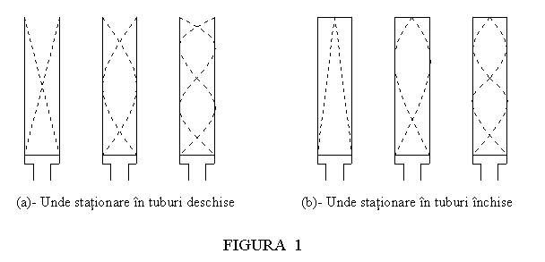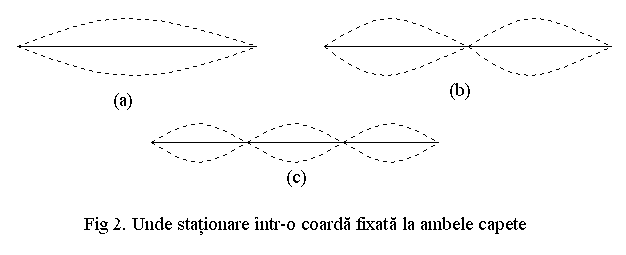 Se considera o coarda de lungime l, fixata la ambele capete. Daca ea este ciupita, se vor propaga vibratii transversale de-a lungul corzii; aceste perturbatii se reflecta pe capetele fixe si se formeaza astfel o unda stationara. Modurile proprii de vibratie ale corzii sunt astfel excitate si aceste vibratii dau nastere unor unde longitudinale în aerul înconjurator care le transmite pâna la urechile noastre ca un sunet muzical. Când excitam vibratii în aceasta coarda în locurile în care este fixata coarda, adica la capetele ei, se formeaza noduri iar la mijlocul coardei se va forma un ventru (figura 2 - a). Acestei vibratii îi corespunde o anumita frecventa ν1.