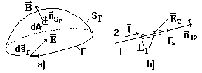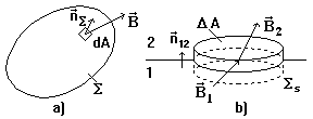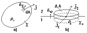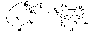 Fig. 1.3-2. Notatii pentru legea fluxului electric (a) si cazul suprafetei de discontinuitate (b). |