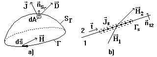Fig. 1.3-1. Conventii la scrierea legii inductiei electromagnetice (a) si cazul unei suprafete de discontinuitate (b). |
