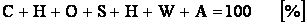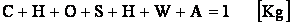 COMPOZITIA CHIMICA a combustibililor precizeaza cantitatile de elemente active care iau parte la procesul de ardere (masa combustibila) precum si cantitatile de compusi care nu participa la ardere (balast). Din prima categorie fac parte: carbonul (C), hidrogenul (H), oxigenul (O) si sulful (S), iar balastul se compune din: azot (N), umiditate (W), cenusa (A). Suma acestor participanti trebuie sa indeplineasca conditia: