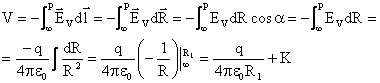 sarcina q care produce un potențial V în punctul P la distanța R1 (