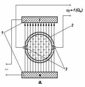 tubului trec electrozii 3, īntre care apare o tensiune electromotoare ut,