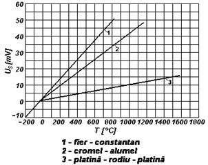Īn figura sunt prezentate caracteristicile statice pentru termocuplurile fier - constantan (Fe - Const.), cromel - alumel (C - A) si platina rodiu - platina (Pt Rh - Pt).
