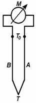 Aceste traductor denumite frecvent si termocuplu este compus din doi electrozi A si B, confectionati din metale diferite, care se sudeaza la unul din capete. Capetele nesudate se numesc reci" sau "libere si au aceeasi temperatura T0. Punctul de sudura al electrozilor se numeste capat "cald" sau "sudat" al termocuplului si se gaseste la o anumita temperatura T (fig.1.15).