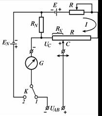 Pozitia 1 a comutatorului K corespunde masurarii. Īn acest caz tensiunii UAB i se opune caderea de tensiune UC culeasa pe rezistenta RX (UC=RX I). Se poate afla o asemenea pozitie a cursorului C, astfel īncāt UAB=UC, pozitie pusa īn evidenta de un galvanometru. Prin urmare fiecarei valori UAB, īi corespunde o anumita pozitie a cursorului C. Daca R este o rezistenta calibrata si liniara, aparatul se poate etalona, atasāndu-se acestei rezistente o scala gradata direct īn unitati de temperatura.