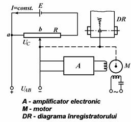 La instalatii industriale se utilizeaza potentiometrele electronice automate (figura 1.18.b). Daca tensiunile UC si UAB nu sunt egale, la intrarea amplificatorului A apare semnalul de eroare DI, respectiv o tensiune asociata acestuia. Amplificatorul electronic A comanda motorul M, care, rotindu-se īntr-un sens corespunzator, deplaseaza cursorul reostatului R, si īn acelasi timp cu acesta, acul indicator si īnregistrator al aparatului. Astfel daca UAB>UC, cursorul reostatului va fi deplasat spre dreapta si daca UAB<UC, spre stānga. Deplasarea cursorului īn sensul corespunzator are loc pāna cānd se realizeaza egalitatea UC=UAB, situatie īn care semnalul de eroare este nul si motorul M este īn repaus. Scala aparatului este gradata direct īn unitati de temperatura.