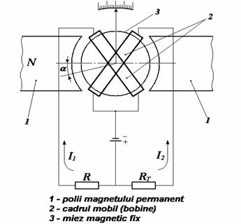 O parte componenta a acestuia este un cadru mobil, alcatuit din doua bobine, de care este fixat acul indicator. Fiecare din cele doua bobine formeaza cāte un cuplu, acestea fiind de sensuri opuse; egalitatea celor doua cupluri determina pozitia de echilibru a echipajului mobil. Cadrul mobil este atasat īn īntrefierul unui magnet permanent. Forma circuitului magnetic este astfel alcatuita īncāt inductia este maxima pe axa polilor si scade catre extremitatile pieselor polare. Din acest motiv, inductia īn īntrefier este o functie de marimea unghiului a de deplasare a cadrului mobil. Caracteristica statica este: