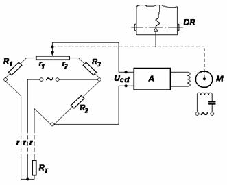 Atunci cānd puntea este neechilibrata, tensiunea Ucd se aplica la intrarea amplificatorului A, a carui iesire comanda motorul asincron bifazat M. Acest semnal de comanda, īmpreuna cu alimentarea din cealalta īnfasurare a motorului, creeaza un cāmp magnetic rotitor, care conduce la miscarea rotorului si astfel prin legatura mecanica reprezentata punctat, este pus īn miscare cursorul pentru echilibrarea puntii. Scala aparatului indicator īnregistrator este gradata īn unitati de temperatura.