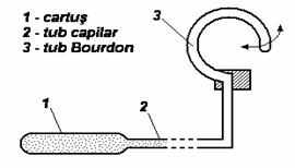 Traductoarele bazate pe dilatarea lichidelor si gazelor se construiesc sub forma unui cartus conectat printr-un tub capilar la un element deformabil, de exemplu tub Bourdon, figura 1.23.