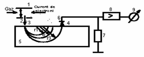 Curentul electric a carui marime este determinata de numarul de ioni ce lovesc colectorul īn unitatea de timp, produce pe rezistenta 7, o cadere de tensiune, care este amplificata īn amplificatorul de curent continuu 8 si este īnregistrata la aparatul de masurare 9.