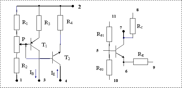 Montajul consta în grupul de componente din figura de mai jos. Grupul format din tranzistoarele T1, T2, rezistentele R1, R2, R3, R4 si potentiometrul P constituie o sursa dubla de curent reglabila. Când se foloseste în montaje pentru a furniza curentii de baza necesari tranzistorului npn în conexiune EC atunci sursa se alimenteaza cu +5 V la borna 2 fata de borna de masa (borna 1) si atunci se obtine la borna 3 un curent reglabil (în sensul sagetii) între 0 mA. Pentru curentii de emitor necesari aceluiasi tranzistor npn în conexiune BC, sursa se alimenteaza cu -5V la borna 2 fata de borna 1 (borna de masa) si se obtine la borna 4 un curent reglabil între 0 50 mA.