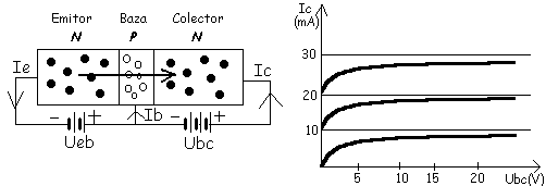 Peste anumite valori ale tensiunii baza-colector toti electronii injectati in baza sunt colectati de colector, curentul de colector atinge valori de saturatie si curentul de baza (care circula intre baza si sursa Ubc) este foarte mic. Se observa ca pe masura ce creste curentul emitorului creste si curentul colectorului, iar tensiunea baza-colector practic nu influenteaza curentul colectorului.
