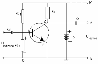 Intrarea in circuitul emitorului se face intre punctul masa si baza cu ajutorul unui condensator Cs care lasa sa treaca numai componentele alternative. Iesirea se face la capetele rezistorului de sarcina. Condensatorul C's lasa sa treaca numai componenetele alternative si de aceea este indiferent daca iesirea se face intre punctele a si b' sau intre a si b care include si sursa. In al doilea caz, insa, se poate face conectarea etajului la intrarea unui etaj de amplificare, analog.