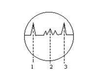 Aceste incoveniente sunt īn buna masura eliminate de defectoscoapele prin reflexie (sau īn impulsuri). La acestea emitatorul si receptorul sunt situate de aceeasi parte a piesei unul lānga altul (fig.2a). Ultrasunetele se propaga prin piesa, ajung la fata opusa unde sunt reflectate si apoi revin la receptor. Daca īn piesa exista un defect, semnalul ultrasonor se va reflecta de acesta si va ajunge mai devreme la receptor decāt cel reflectat de fata opusa. Emitatorul genereaza impulsuri scurte la intervale lungi constante care īmpreuna cu semnalul reflectat sunt marcate pe ecranul unui oscilograf. Īn fig.2b prin 1 si 3 am indicat locurile unde spotul luminos are devieri bruste care marcheaza momentele īn care a fost emis semnalul ultrasonor si respectiv īn care a fost receptat semnalul reflectat de fata opusa. Prin 2 am indicat locul unde este indicata primirea unui semnal reflectat de un defect. Pozitia relativa a acestuia īn raport cu 1 si 3 ne permite sa determinam adāncimea la care se gaseste defectul.