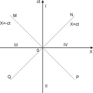I) (MON)- cuprinde linii de univers corespunzatoare punctelor materiale care se misca cu v<c (X=vt). Intervalul de univers între evenimentul O si evenimentele din regiunea I va fi: