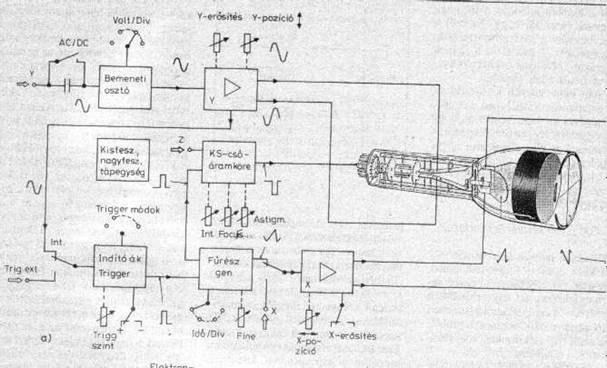 Din punct de vedere constructiv, un astfel de aparat ce permite vivualizarea pe un ecran a unor forme de unda pe langa tubul catodic are nevoie de unele circuite conexe: