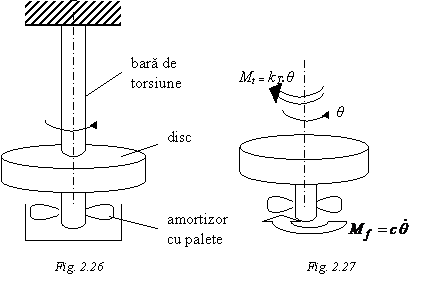 Se considera acelasi sistem oscilant din figura 2.8, in care s-a atasat volantului un amortizor cu palete, care sunt sufundate intr-un vas plin cu lichid vascos. Ansamblul a fost reprezentat in figura 2.26. La rotirea discului cu unghiul θ in sens trigonometric, asupra discului, prezentat izolat, dupa ruperea legaturilor, in figura 2.27, asupra discului actioneaza momentul de torsiune elastic al barei de suspensie si momentul de frecare generat de amortizorul vascos, orientate in sens orar. Ele sunt achilibrate de momentul cinetic, conform ecuatiei:
