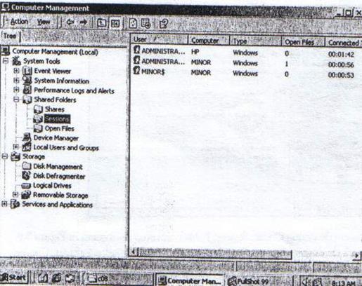 Cand selectati in utilitarul Shared Folders, veti vedea toti utilizatorii care acceseaza in acest moment folderele partajate de pe calculator. Figura 7.10 prezinta un exemplu de listare a sesiunilor in Shared Folders.