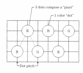Daca se doreste afisarea de imagini colorate atunci sunt necesare trei fluxuri de electroni care sa atinga suprafata ecranului luminând în trei culori diferite. În mod uzual sunt folosite trei culori de baza: rosu, verde si albastru. Cu aceste trei culori de baza se genereaza toate tipurile de culori prin amestecarea acestora. Un punct alb de exemplu, rezulta prin amestecarea celor trei culori la aceeasi intensitate. Astfel, la monitoarele color toate cele trei fluxuri de electroni sunt modulate corespunzator informatiei de imagine, intensitatea absoluta a fluxului determinând stralucirea, iar intensitatea relativa a fluxului determinând culoarea pixelului corespondent.