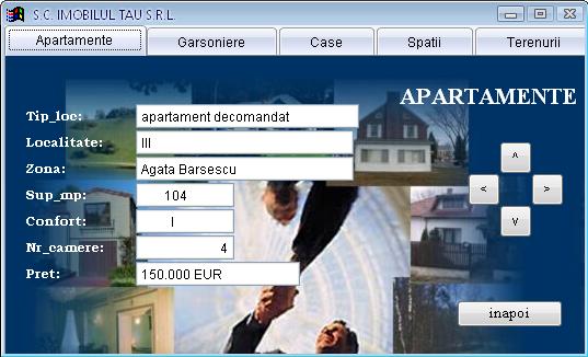 VIZUALIZARE - pentru o vizualizare cat mai usoara am folosit in aplicatie pageframe-ul, in partea de sus a aplicatiei sunt puse in pageframe,cate o pagina pentru apartamente,garsoniere,case,spatii respectiv terenurii.