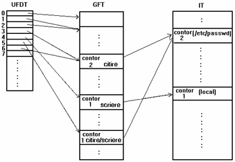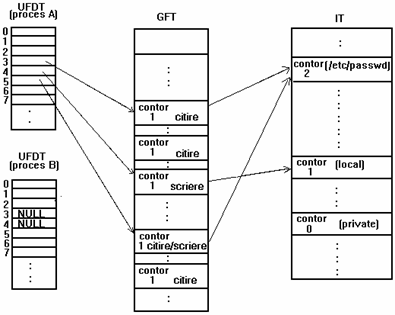tabela descriptorilor de fisier utilizator (User File Descriptor Table-UFDT) se afla în zona alocata procesului si are câte o intrare pentru fiecare descriptor de fisier utilizat de un proces;