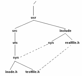 urmatoarele trei nume vor referi acelasi fisier "/usr/src/uts/sys/testfile.h", "/usr/include/sys/testfile.h", "/usr/include/realfile.h" (vezi figura 5.28).