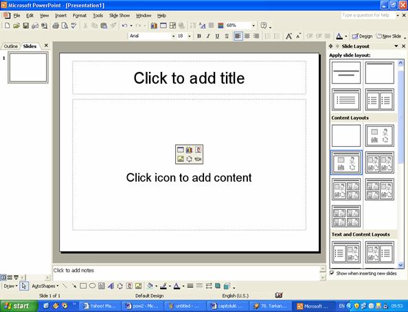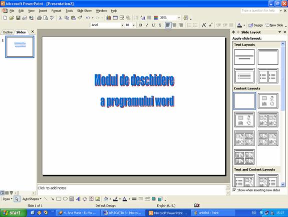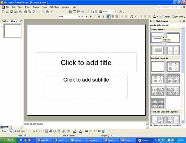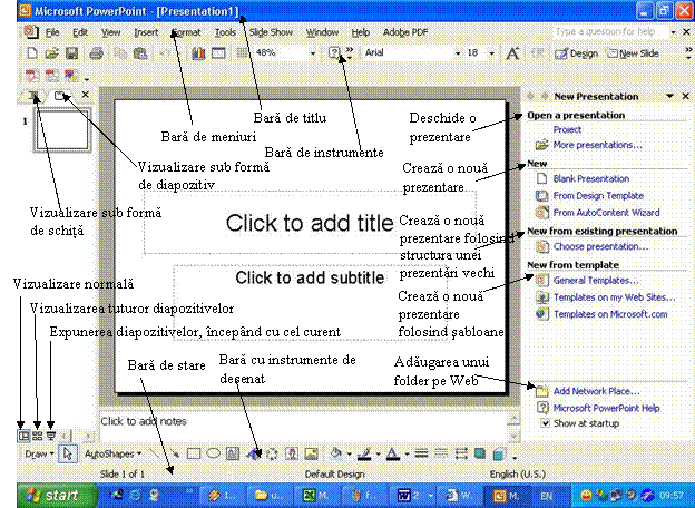 Când deschidem aplicatia Microsoft PowerPoint automat se deschide cu o prezentare noua, asa cum este prezentata în figura 2. Cu ajutorul panoului de activitati prezentat în figura 13, sau cu ajutorul meniului, se poate realiza o prezentare: