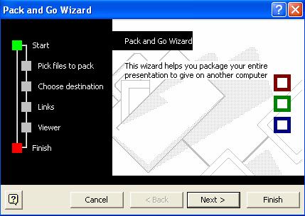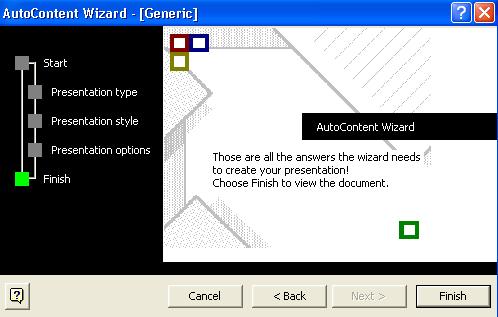 Asistentul se poate manevra foarte usor cu ajutorul butoanelor Next, Back, Cancel, Finish. Cele cinci etape ale realizarii unei prezentari cu ajutorul asistentului sunt: start, presentation type, presentation style, presentation options, finish.
