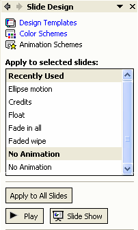 Daca se doreste aplicarea unei scheme întregii prezentari trebuie sa apasam butonul Apply to all Slides, butonul Play se apasa daca se doreste o vizualizare a efectului din diapozitivul curent, iar butonul Slide Show se apasa daca se doreste vizualizarea întregii prezentari.